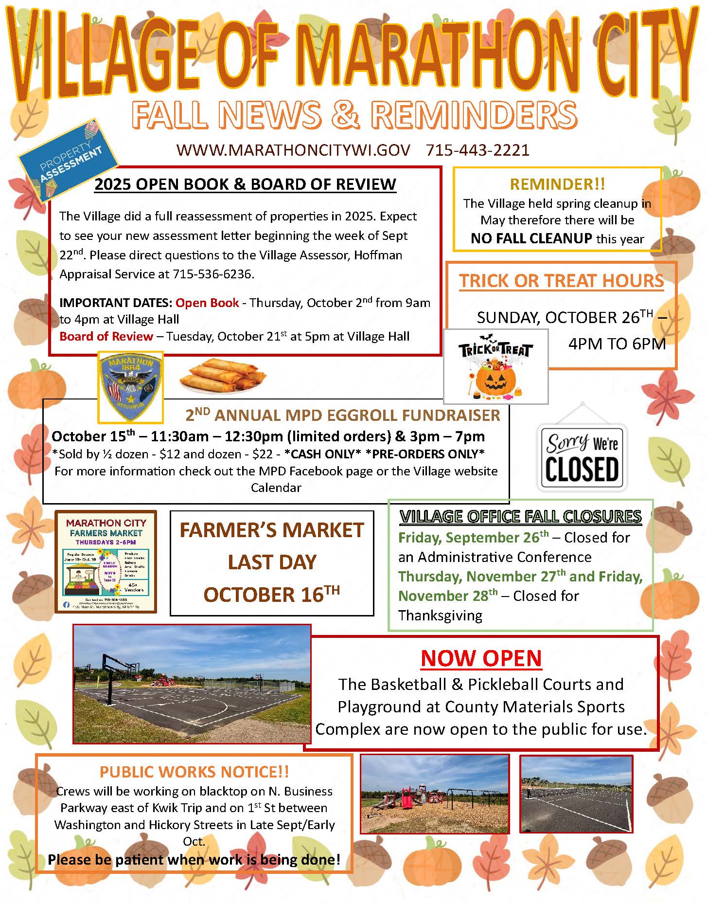 FALL NEWSLETTER Sep 12, 2025 | Administration, Community, General, Parks & Recreation, Streets Please see the attached Newsletter of updates and events happening throughout the Village this fall. Feel free to contact the Village Office at 715-443-2221 for any questions of concerns. FALL 2025 NEWSLETTER